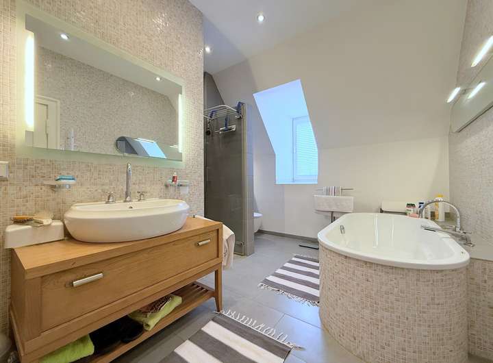 - Badezimmer mit freistehender Badewanne und Walk-In-Shower