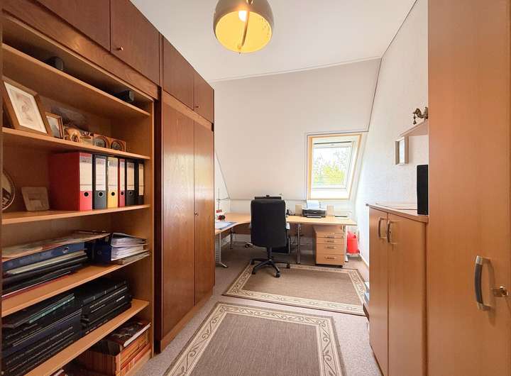 Der Windfang mit Garderobe und die repräsentative Diele heißen Bewohner und Gäste stilvoll willkommen. Im Erdgeschoss verbindet ein zweigeteilter Wohnbereich – abgetrennt durch eine elegante Schiebetür und maßgefertigte Einbauten – Komfort mit Atmosphäre. Perfekt für gesellige Abende oder entspannte Momente. Im Dachgeschoss befinden sich vier Schlafzimmer, ein Arbeitszimmer sowie ein beeindruckendes Badezimmer mit freistehender Badewanne und moderner Walk-In-Dusche. Zwei zusätzliche Gäste-WCs sorgen für Komfort im Alltag. Ein historischer Speiseaufzug, der Erdgeschoss und Keller verbindet, unterstreicht den besonderen Charakter der Immobilie. Die große Einbauküche, eine separate Vorbereitungsküche und eine großzügige Bar schaffen ideale Voraussetzungen für kulinarische Ansprüche und repräsentative Anlässe. Darüber hinaus verfügt das Dachgeschoss über weiteres Ausbaupotenzial.