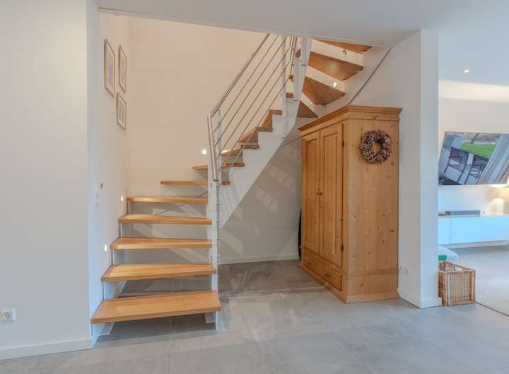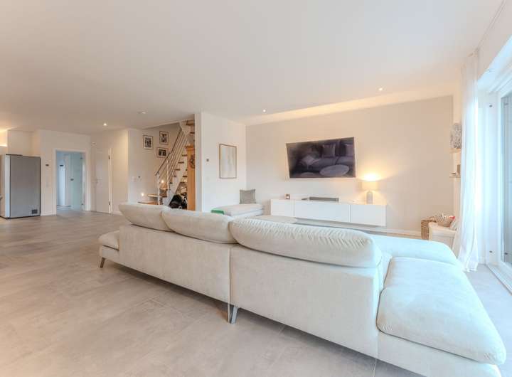 Der offene Wohn- und Essbereich ist großzügig geschnitten und bietet viel Platz für gemütliche Stunden mit Familie und Freunden. Ein Gäste-WC sowie hochwertige Nolte-Küche mit Markengeräten runden das Erdgeschoss ab.