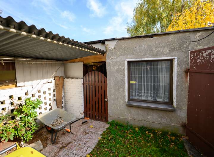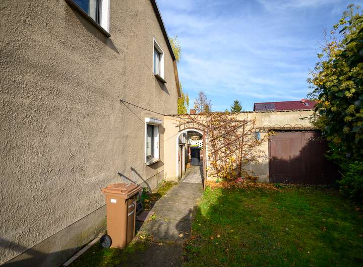 Die Bebauung besteht aus einem zweigeschossigen Einfamilienhaus aus den 1930er Jahren, welches seit längerer Zeit nicht mehr bewohnt wird. Es gibt Schäden am Dach, die Leitungssysteme sind nicht modernisiert und es hat auch keine Wärmedämmung stattgefunden. Aufgrund des Zustands ist von Abriss auszugehen, auch die Raumaufteilung entspricht nicht mehr modernen Standards. Die Maße des Hauses betragen: 8,7 m x 8 m für das Hauptgebäude, dazu 8 m x 2,3 m für einen eingeschossigen Anbau. Dahinter befinden sich mehrere Nebengebäude wie Schuppen. All diese Aufbauten befinden sich am hinteren Grundstücksrand.
