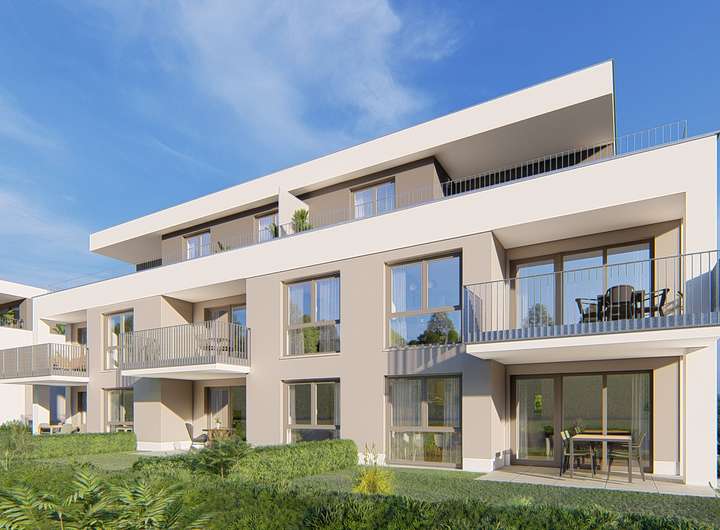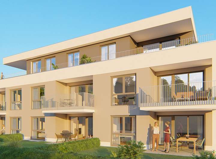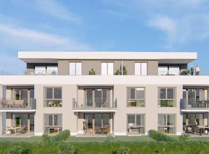 Die Wohnungen verfügen entweder über eine Terrasse mit Garten oder einen Balkon oder eine Dachterrasse.