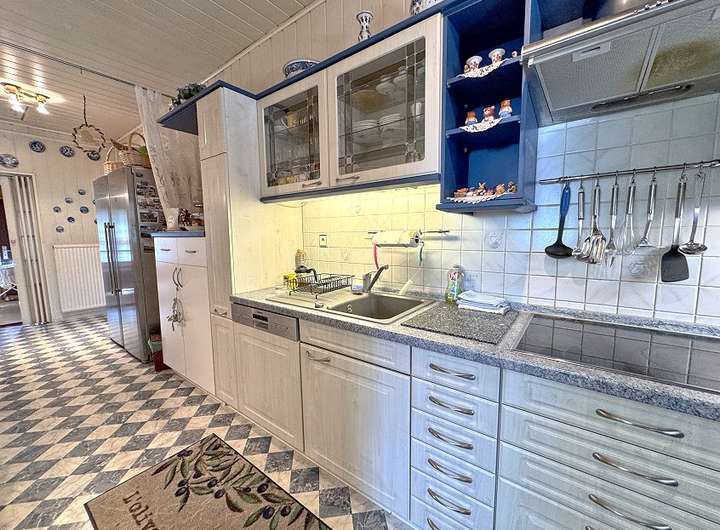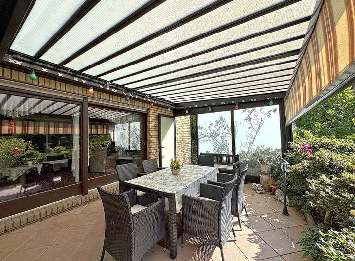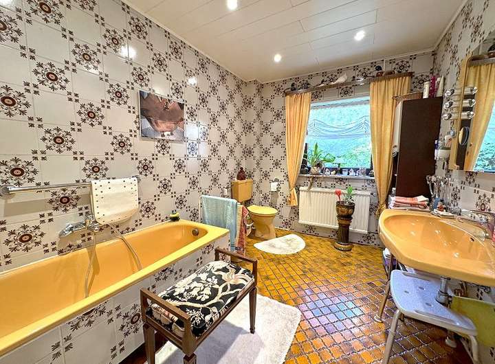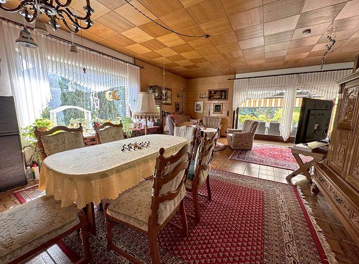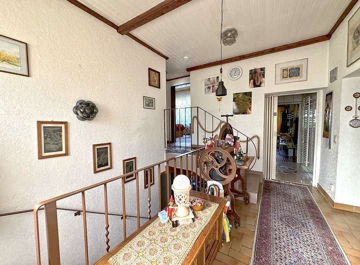 Das Haus wurde um 1950 in massiver Bauweise errichtet und 1974/1975 um einen Anbau erweitert. Zwischen Altbau und Anbau entstand ein interessantes Split-Level, das den Eingangsbereich optisch und räumlich auflockert. Insgesamt stehen ca. 166 m² Wohnfläche auf einer Ebene zur Verfügung. Der Teilkeller bietet zusätzliche Nutzfläche und Platz für Heizung und Vorräte.