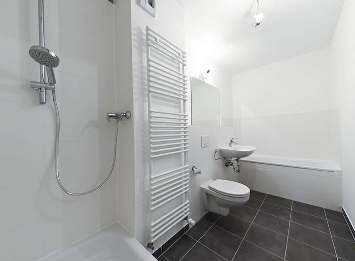 Badewanne, Dusche, Fliesenboden, Barrierearmer Zugang bis zum Mietobjekt, Warmwasser zentral Fernwärme Dritte, Wärmetauscher, Kunststoff-Bodenbelag, Steinboden