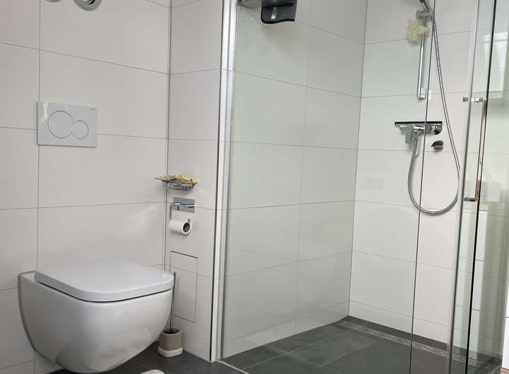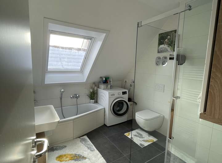 Das Badezimmer ist mit großem Fenster, Badewanne und begehbarer Duschkabine ausgestattet. Alle Räume verfügen über Fußbodenheizung mit elektrischen Thermostaten. Zusätzlich stehen ein Multimedia-Anschlusskasten und LAN-Dosen in jedem Zimmer zur Verfügung. Eine Wallbox für ein E-Auto ist ebenfalls vorhanden.