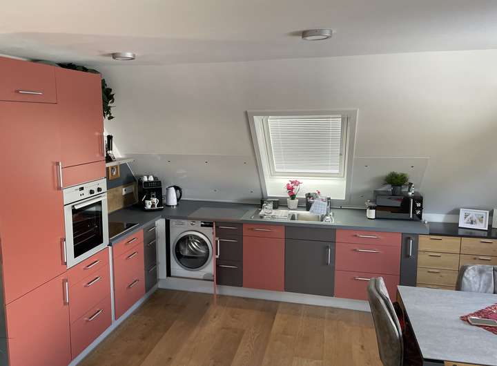 Die Wohnung verfügt über eine hochwertige Einbauküche. Die Farben der Einbauküche wirken in der Realität deutlich angenehmer und harmonischer als auf den Fotos. Mehrere Interessenten haben bereits bestätigt, dass die tatsächliche Optik wesentlich ruhiger und weniger intensiv erscheint als auf den Bildern.