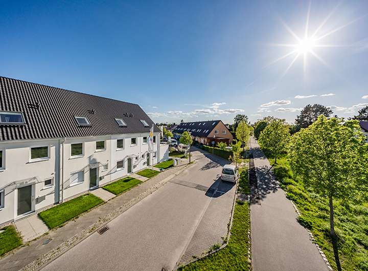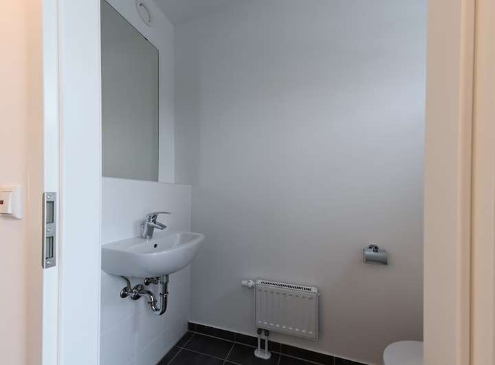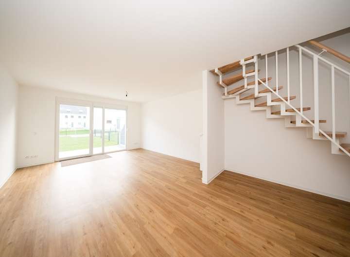 Im Erdgeschoss des Hauses befindet sich eine offene Küche, das Wohnzimmer, der Hauswirtschaftsraum sowie ein Gäste-WC. Über das Wohnzimmer haben Sie Zugang zur Terrasse, sowie zu Ihrem eigenen, mit niedrigen Zäunen abgetrennten, gemütlichen Garten.