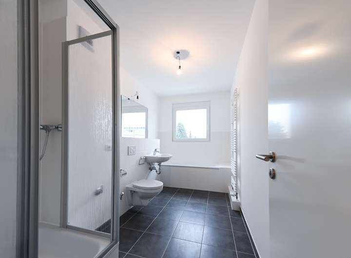 Badewanne, Dusche, Fliesenboden, Barrierearmer Zugang bis zum Mietobjekt, Warmwasser zentral Fernwärme Dritte, Wärmetauscher, Terrazzo, Kunststoff-Bodenbelag