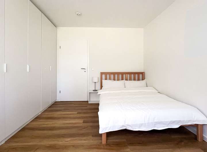 Schlafzimmer mit Bett (140 × 200 cm), Nachttisch und großer Schrankwand