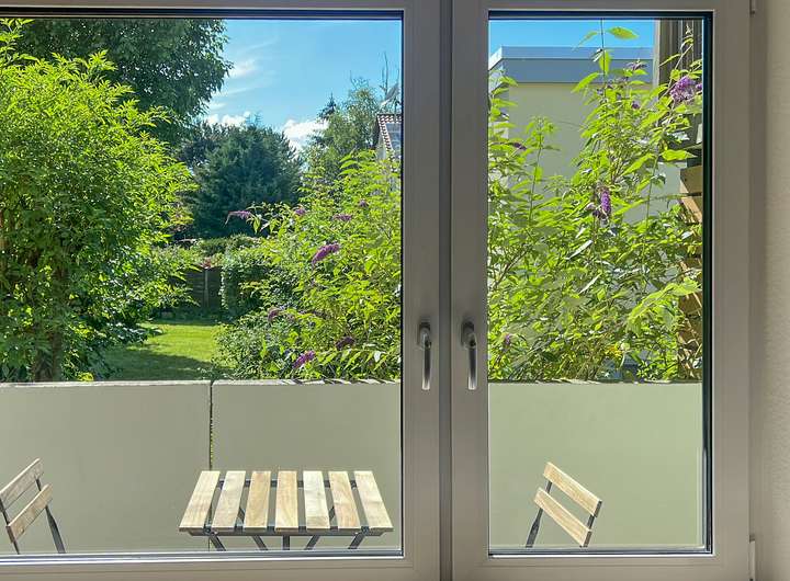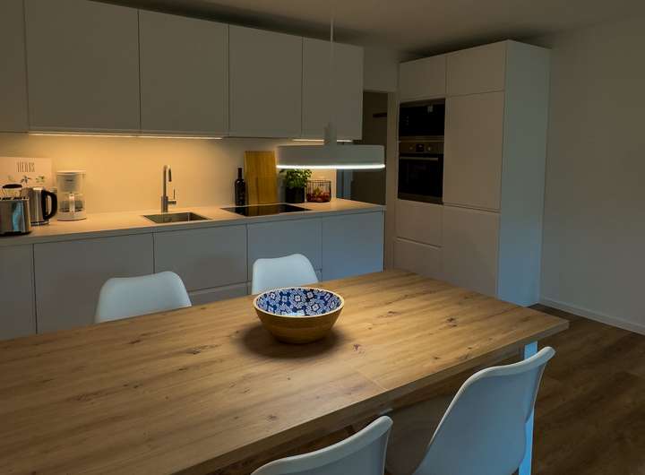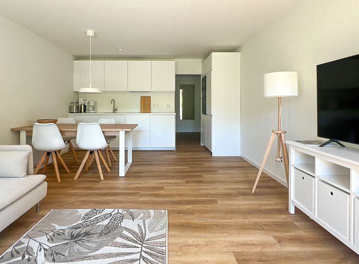 Wohnzimmer mit voll ausgestatteter (Töpfe, Pfannen, Geschirr, Besteck etc.) weißer Einbauküche mit Geschirrspüler, Waschmaschine, Induktionskochfeld, Kühl-/Gefrierschrank, Backofen, Mikrowelle, Toaster und Wasserkocher, Essbereich mit großem Tisch und vier Stühlen. Wohnbereich mit bequemem Sofa, Couchtisch, TV-Board und großem Smart-TV. Große Fensterfront mit Blick in den Garten und direktem Zugang zum Balkon
