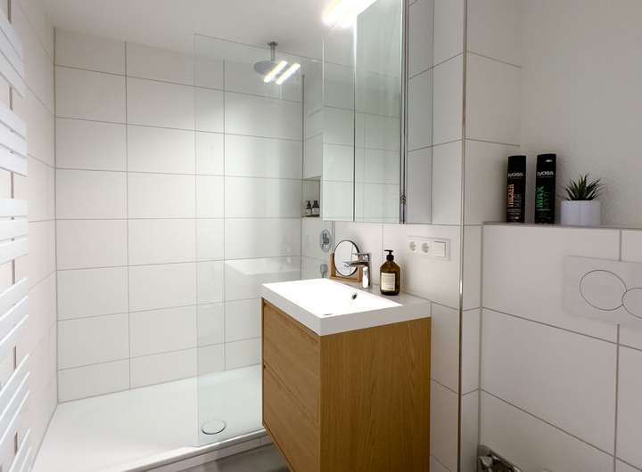 Badezimmer mit WC, großer Regendusche, Waschtisch, Spiegelschrank und Handtuchheizkörper