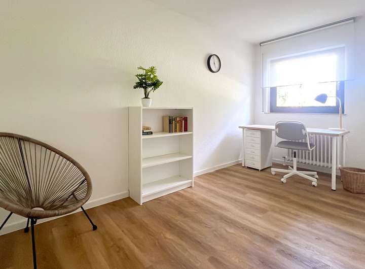 Arbeitszimmer mit Regal, Schreibtisch und Stuhl – kann bei Bedarf auch als weiteres Schlafzimmer genutzt werden