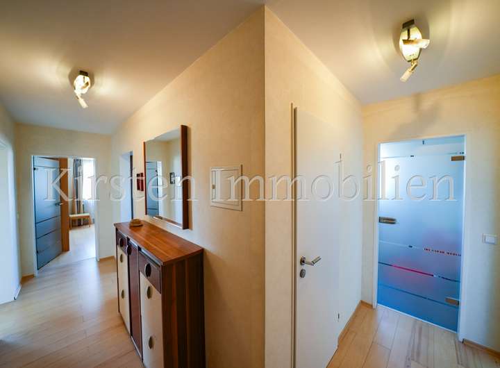 Nach dem Betreten der Wohnung erwartet Sie ein freundlicher Flurbereich mit praktischem Abstellraum. Von hier erreichen Sie das Kinder- oder Gästezimmer, das separate WC, das modernisierte Tageslichtbad mit Dusche und Waschbecken sowie die Küche mit gepflegter Einbauküche und integriertem Waschmaschinenanschluss.