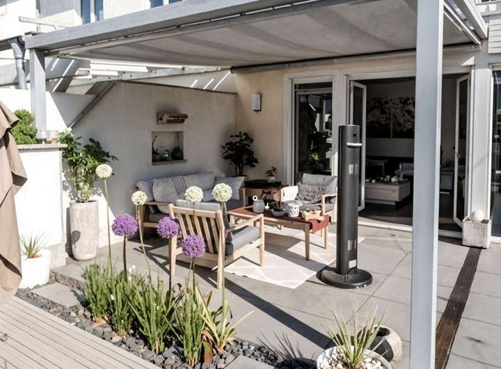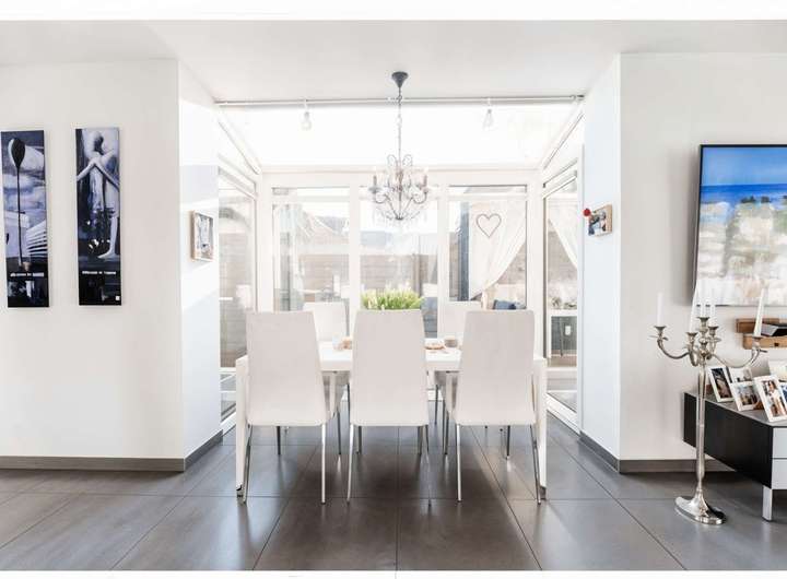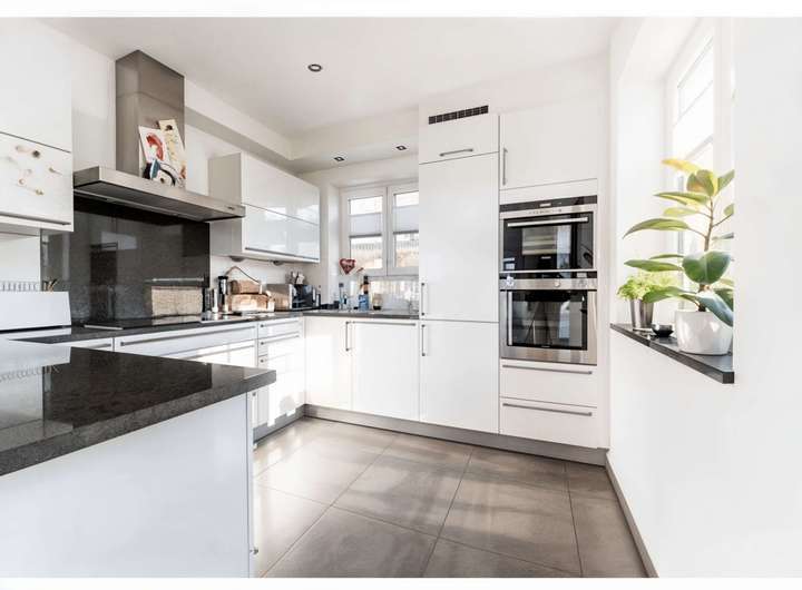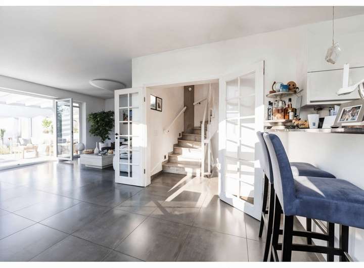 Auf ca. 162 m² und vier Ebenen entfaltet sich ein lichtdurchflutetes Ambiente mit großzügigen Räumen und edlen Materialien. Das Herzstück bildet der offene Wohn-/Essbereich mit raumhoher Fensterfront und eigenem Kamin; von hier führt der Weg direkt hinaus in den Garten zur sonnigen Lounge. Der stilvolle Outdoor-Bereich inszeniert lässig-elegantes Urlaubsflair und wird von einer separaten Gartenlounge ergänzt. Angeschlossen an den Wohn- und Essbereich präsentiert sich die hochwertige, offene Küche.