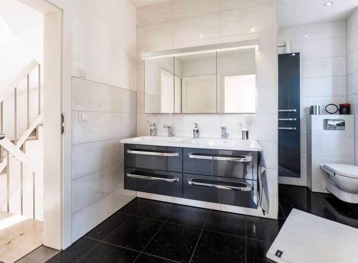 Der Keller des Hauses geht weit über reine Nutzfläche hinaus: Ein vollwertiges Duschbad und ein erstklassig ausgestattetes Home-Gym verlängern das Wellness-Gefühl ins eigene Zuhause.