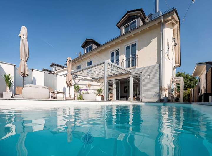 Der beheizbare Pool mit römischer Treppe und die stilvoll gestalteten Ruhebereiche verwandeln den Garten in eine private Resort-Landschaft – ein Statement für luxuriöses Wohnen.