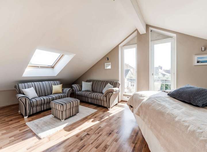 Im Dachgeschoss entsteht Ihr privater Rückzugsort: das Master-Schlafzimmer mit Platz für eine Sitz- oder Leseecke und Raum für individuelles Design. Die hohen Fensterflächen bringen reichlich Tageslicht ins Zimmer.
