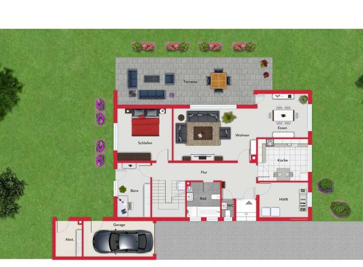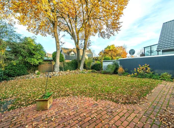 Zum Haus gehören eine Garage mit angrenzendem Abstellraum sowie ein weiterer PKW-Stellplatz im vorderen Bereich der Auffahrt.