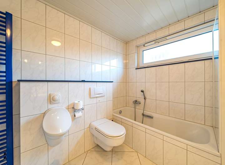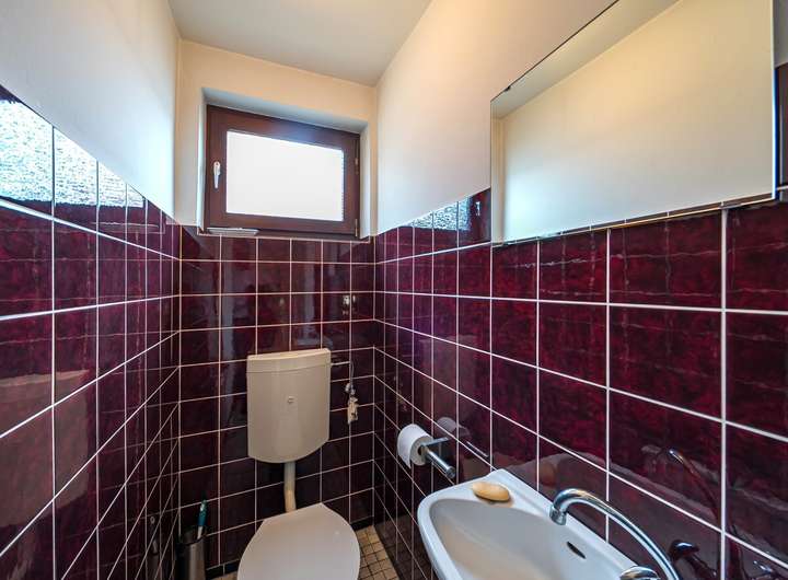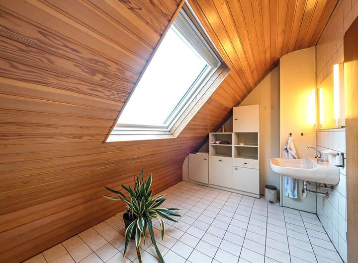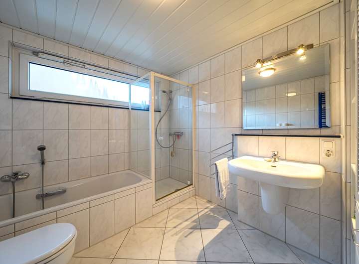 Sanitär: Vollbad mit Fenster (saniert etwa 2000) und Gäste-WC im Erdgeschoss sowie separates WC im Dachgeschoss (baujahrestypisch)