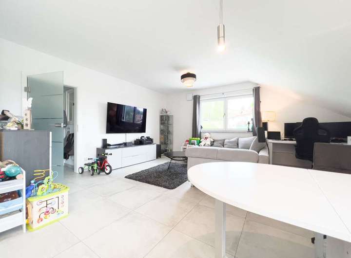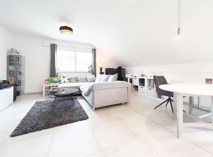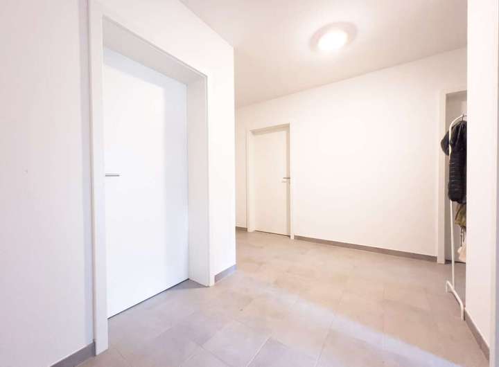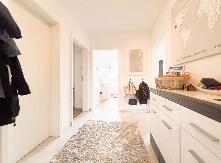 Alle Räume können durch einen geräumigen Flurbereich betreten werden. Die Schlafräume sind mit hochwertigen Laminatböden in Eiche-Optik ausgestattet. Die restlichen Räume wurden mit hellgrauen, modernen und großformatigen Fliesen (60x60 cm) ausgestattet.