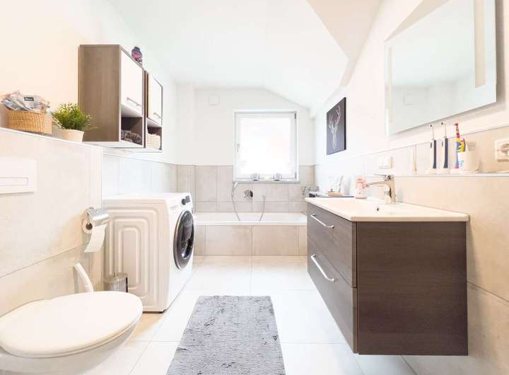 Ein weiterer Pluspunkt ist das wunderschöne Tageslichtbad, das sowohl über eine Badewanne als auch über eine Dusche verfügt. Durch den geräumigen Schnitt bietet das Tageslichtbad ausreichend Platz für diverse Badmöbel. Doch auch für Ihre Waschmaschine wäre Platz genug.