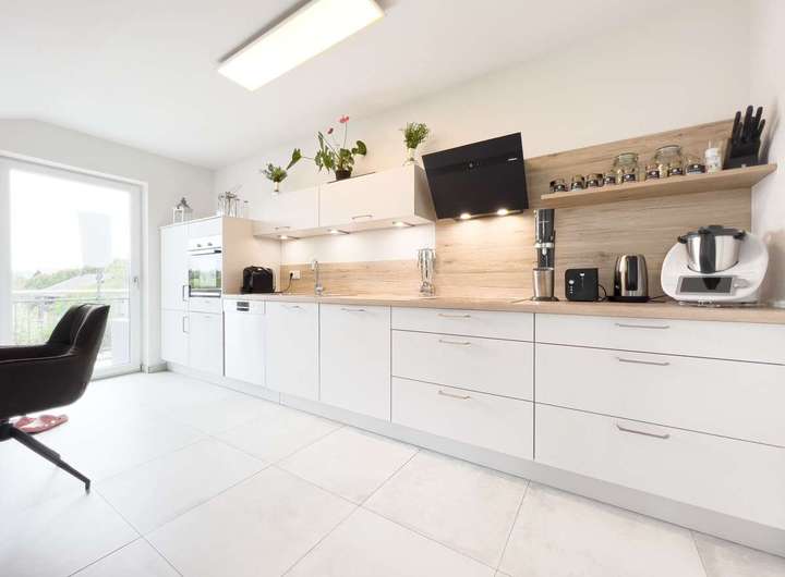 Die Küche ist mit einer großen Arbeitsfläche, einem Backofen, einem Cerankochfeld, einem Dunstabzug, einem Kühlschrank und einer Geschirrspülmaschine ausgestattet. Es wurden nur JUNKER- und BOSCH-Geräte verbaut.