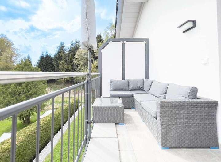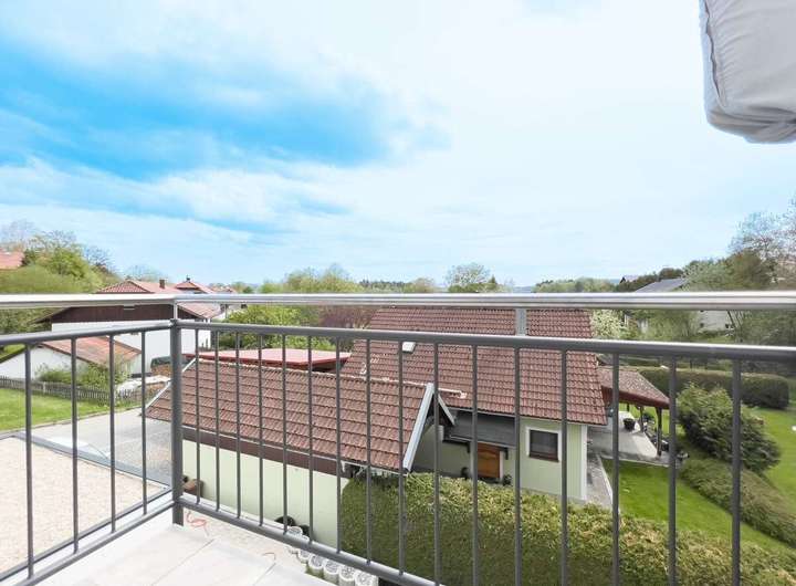 Vom Essbereich aus gelangen Sie auf den großzügigen Balkon, der Ihnen einen wunderschönen Blick ins Grüne bietet.