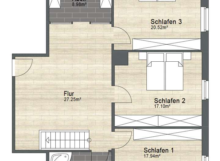 Die obere Etage begrüßt Sie mit einer bezaubernden Atmosphäre. Sie gelangen vom geräumigen Flur, der viel Platz für eine Leseecke bietet, in drei große Schlafzimmer. Hier befindet sich außerdem ein weiterer Abstellraum und ein Badezimmer mit Dusche.