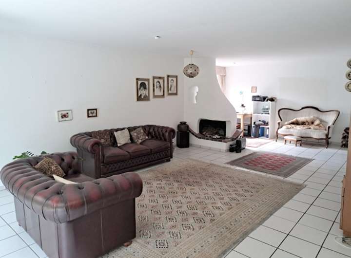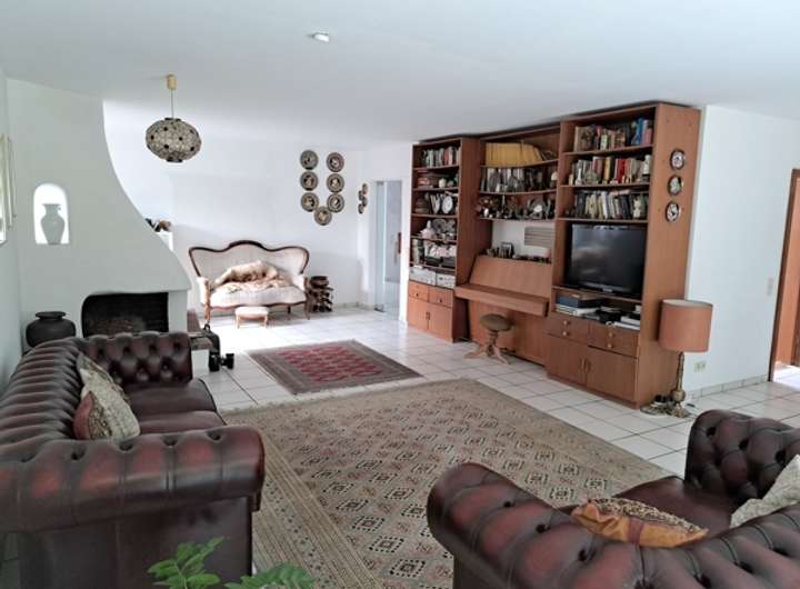 Heller Fliesenboden im Wohn-/ Esszimmer und Diele; Schlafzimmer mit Teppichboden; gefliestes Duschbad mit zwei Waschtischen und großer ebenerdiger Dusche; offener Kamin; große geflieste Terrasse mit Markise; massive Betontreppe zum Souterrain mit Marmorbelag.