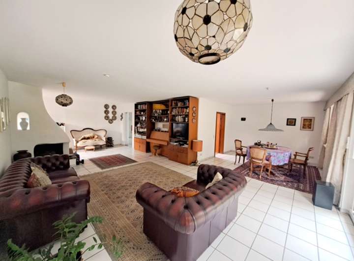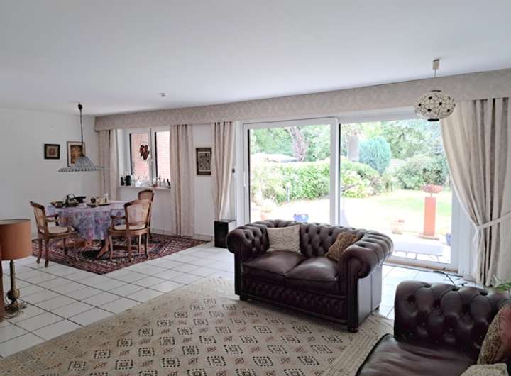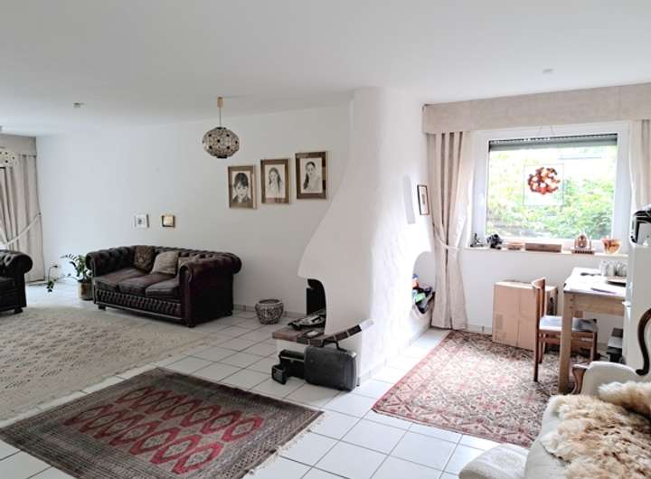Hier sorgt ein offener Kamin für eine wohlige Atmosphäre an kühleren Tagen. Eine große Fensterfront mit Schiebetürelement gewährleistet freundliche Lichtverhältnisse und einen schönen Ausblick in die Gartenanlage.