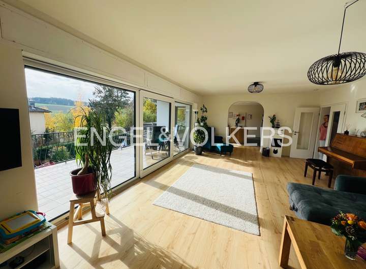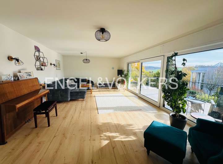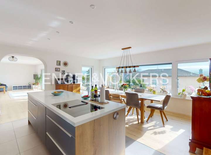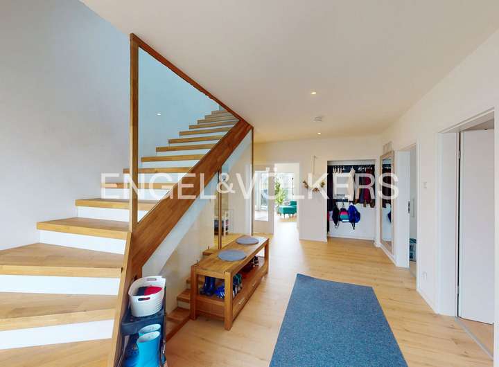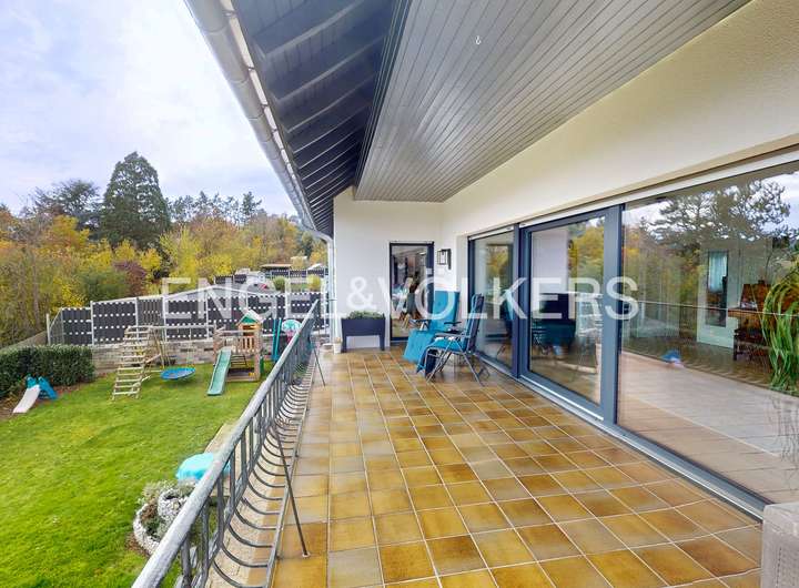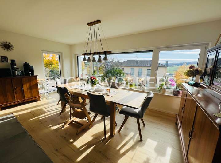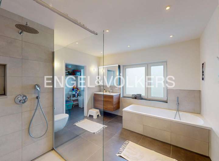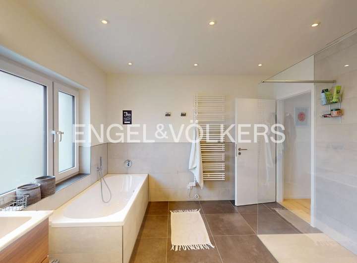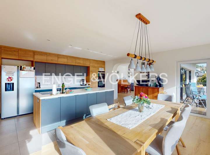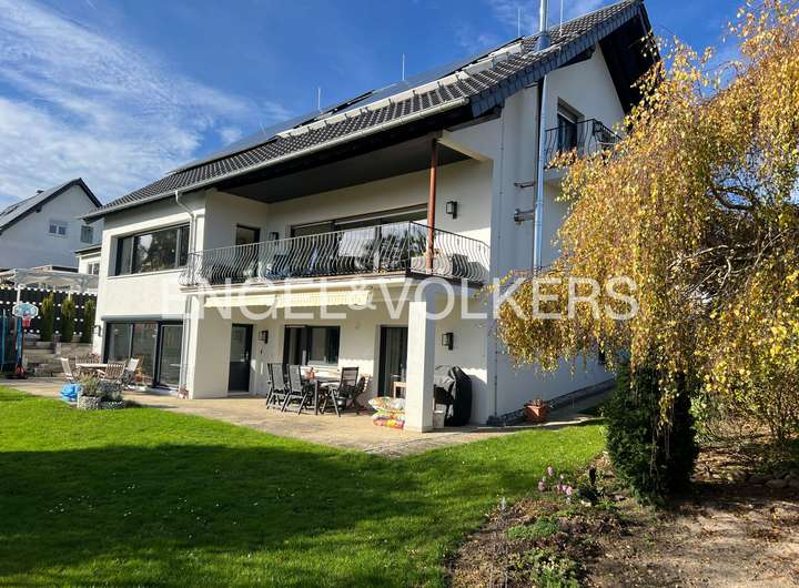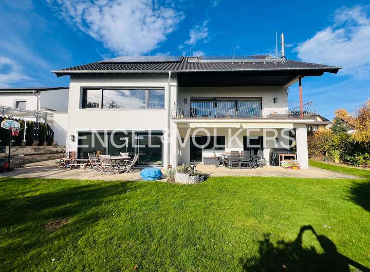 Dieses beeindruckende Einfamilienhaus, in einem ruhigen, ländlich geprägten Ortsteil von Taunusstein, vereint moderne Wohnqualität mit großzügigem Raumangebot und einem hohen Anspruch an Energieeffizienz. Ursprünglich 1974 erbaut, wurde die Immobilie im Jahr 2021 umfassend und hochwertig kernsaniert und präsentiert sich heute in einem nahezu neuwertigen Zustand. Auf rund 360 m² Wohnfläche und einem Grundstück von ca. 884 m² bietet das Haus viel Platz für große Familien, die Wert auf Komfort, Nachhaltigkeit und naturnahes Wohnen legen. Insgesamt elf Zimmer verteilen sich auf drei Etagen und ermöglichen vielfältige Nutzungsmöglichkeiten – ob als großzügige Familienräume, Homeoffice, Spiel- oder Gästezimmer. Die modern gestaltete Küche fügt sich harmonisch in das helle Wohnkonzept ein und lädt zum gemeinsamen Kochen und Genießen ein. Große Fensterflächen mit dreifacher Verglasung, elektrische Rollläden und eine überdurchschnittliche Raumhöhe sorgen für ein lichtdurchflutetes, angenehmes Wohnambiente. Im gesamten Haus sind hochwertige Bio-Design-Böden sowie geschmackvolle Fliesen verlegt, die ein harmonisches und zugleich pflegeleichtes Wohngefühl vermitteln. Zwei Balkone und mehrere Terrassenflächen mit Südausrichtung bieten herrliche Ausblicke in die Natur und schaffen wunderbare Rückzugsorte im Freien. Das Haus verfügt über zwei moderne Bäder, einen Wellnessbereich sowie zwei separate Gäste-Toiletten. Im Untergeschoss befindet sich der Wellnessbereich mit moderner Sauna und einem Indoor-Pool von etwa 8 x 4 Metern, welcher über eine große Terrassentür direkten Zugang in den Garten bietet. Der Indoor-Pool ist bislang noch nicht komplett fertiggestellt und bietet somit die Möglichkeit, ihn nach eigenen Vorstellungen auszubauen und individuell zu gestalten. Das Haus wird über eine effiziente Wärmepumpe beheizt, verfügt über eine umfassende Außendämmung, ein komplett erneuertes Dach sowie eine Photovoltaikanlage im Mietmodell, was gemeinsam zur hervorragenden Energieeffizienzklasse A+ beiträgt. Als KfW-85-Haus erfüllt es höchste Ansprüche an nachhaltiges Wohnen. Eine Doppelgarage steht ebenfalls zur Verfügung. Unter der Garage gibt es einen separaten Geräte- und Lagerraum, der vom Garten aus zu erreichen ist.