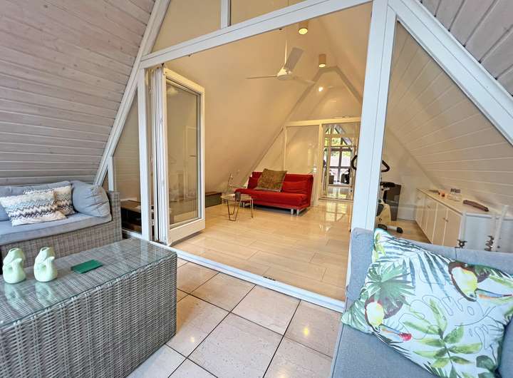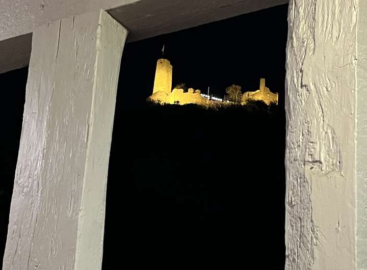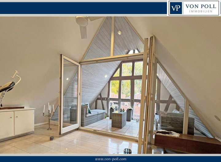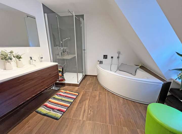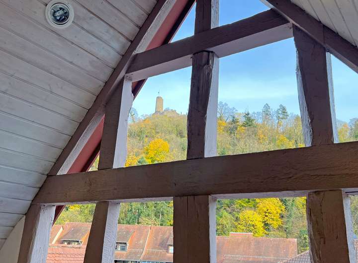 Der ausgebaute Spitzboden stellt ein weiteres Zimmer das man als Schlaf,- oder Wohnbereich nutzen kann, sowie das Highlight dieses Stadthauses, die großzügige überdachte Loggia mit dem begehrten und traumhaftem Blick auf die Burg Windeck, deren abendliche Beleuchtung eine besonders stimmungsvolle Atmosphäre schafft und man hier dem stressigen Alltag entfliehen kann.