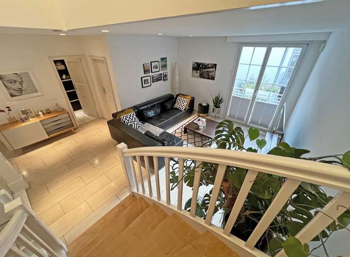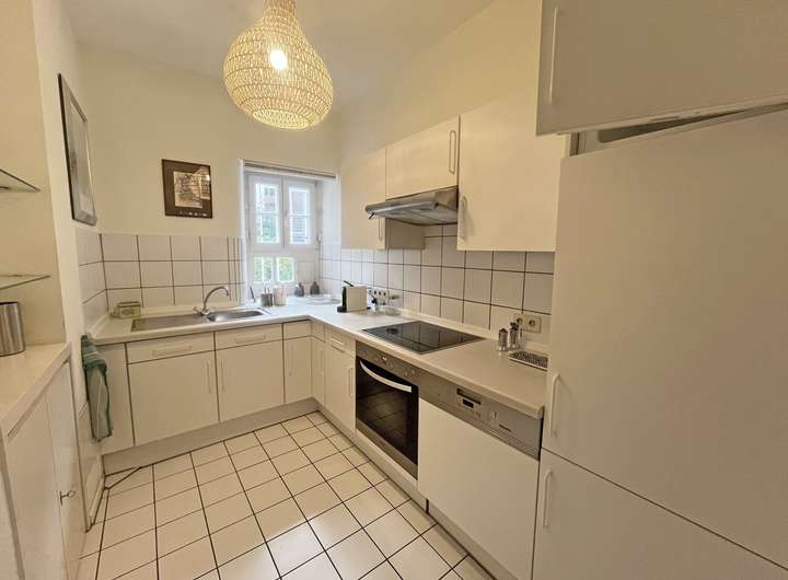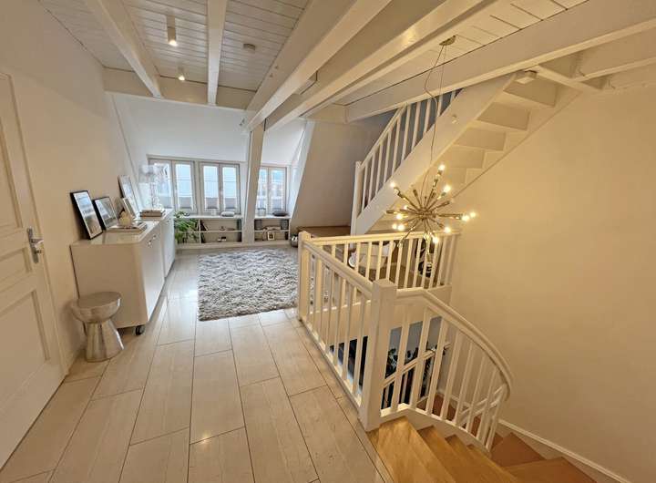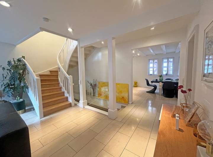Die Hauptebene wirkt offen, großzügig und einladend. Wohnbereich, Küche und Essplatz gehen fließend ineinander über und schaffen ein modernes, urbanes Lebensumfeld - eingebettet in die historische Architektur. Die Verbindung aus traditionellen Balken und klaren Linien verleihen dieser Ebene ihren besonderen Charakter.