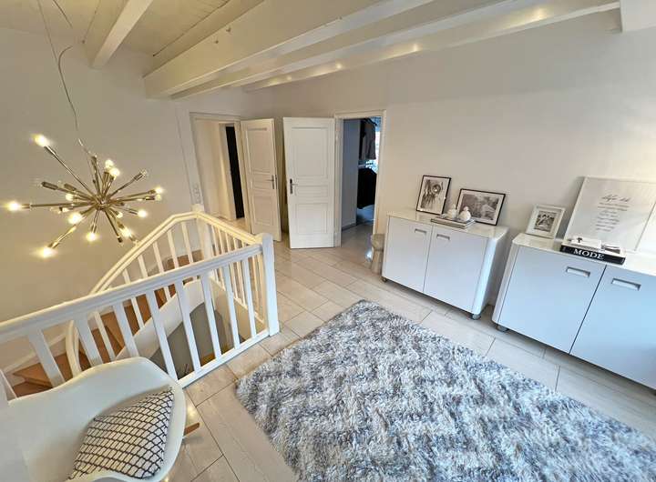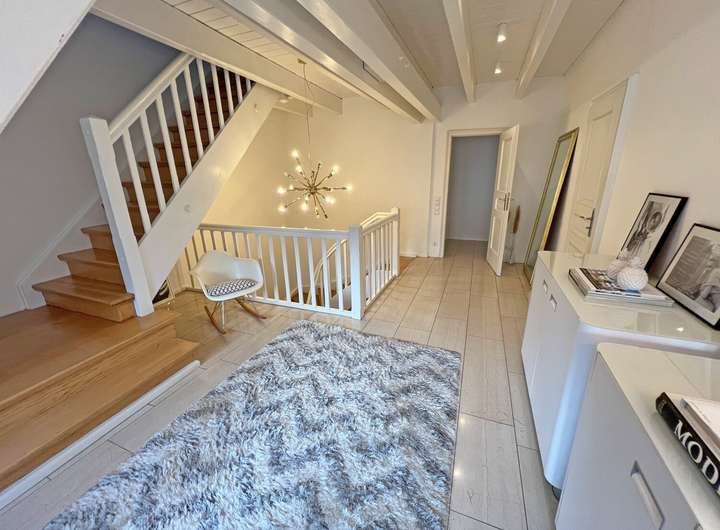 Im Obergeschoss stehen ein großzügiges Schlafzimmer mit angrenzendem Ankleideraum, ein Bürozimmer sowie ein modern ausgestattetes Badezimmer zur Verfügung. Diese Etage bietet hohen Wohnkomfort, viel Raum für Rückzug und hervorragende Bedingungen für ein funktionales und zugleich angenehmes Wohnen.