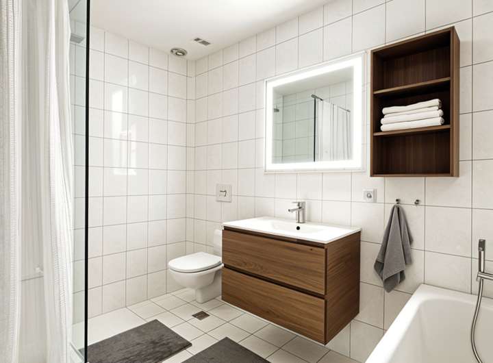 Zur rechten Seite des Eingangs befindet sich das Hauptbad, ausgestattet mit Badewanne, Dusche und WC, sowie ein separates Gäste-WC – besonders praktisch bei Besuch oder für Familien.