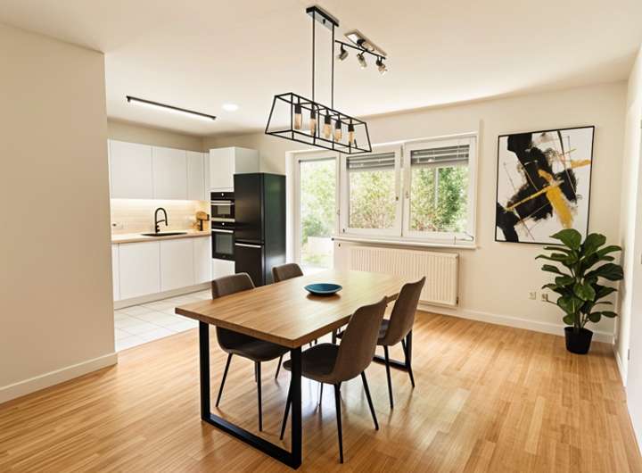 Beim Öffnen der Wohnungstür empfängt Sie ein zentraler Flur, der die Räume strukturiert miteinander verbindet. Zur linken Seite öffnet sich der großzügige, helle Wohn- und Essbereich mit offener Küche. Drei große Fenster durchfluten diesen Bereich mit Tageslicht, und der direkte Zugang zur privaten Terrasse macht ihn zum Zentrum des Wohnens.
