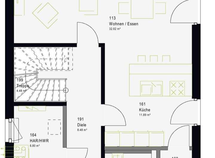 Der ganze Bereich ist an einer Front angesiedelt, sodass man mit der Ausrichtung des Hauses spielen kann, zum Beispiel richten sie das Haus nach Süden aus, ihr habt jetzt von dem ganzen Bereich perfekten Zugang auf Ihre Sonnenterrasse. Des Weiteren findet ihr im Erdgeschoss einen Gästebereich, mit Gäste-WC und Gästezimmer.