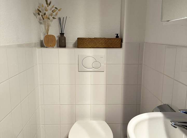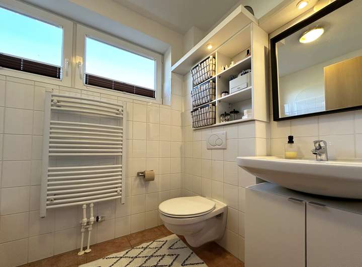 Die wertige und moderne Optik wird auch in dem Gäste- und Vollbad weitergeführt.