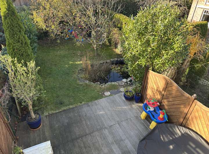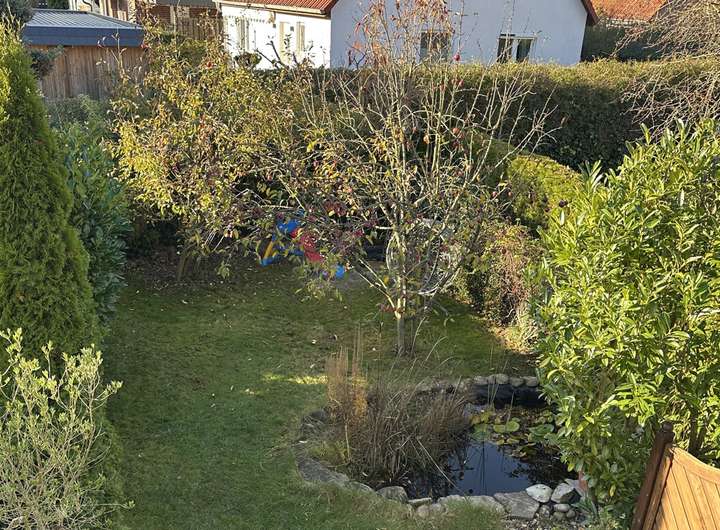 Aus dem Wohnbereich gelangen Sie über eine großzügige Terrasse mit elektronischer Beschattung in den Garten mit Bewässerungsanlage, welcher mit einem Gartenteich liebevoll hergerichtet worden ist.