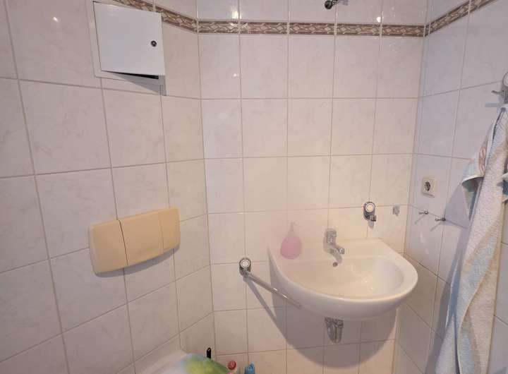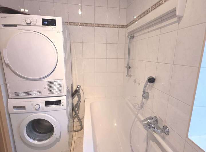 Die Wohnung ist mit pflegeleichtem Laminat ausgestattet. Das Bad ist neutral gefliest.