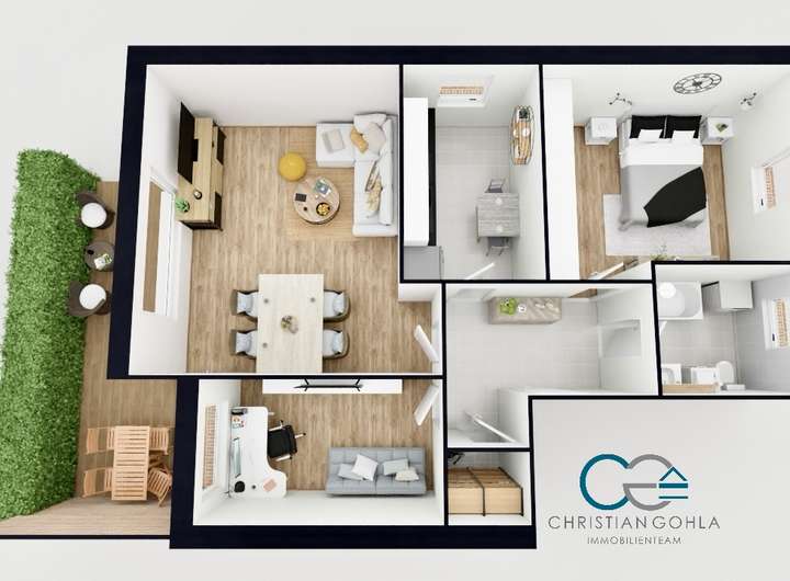 Die 3D-Grundrisse bieten eine realitätsnahe Darstellung der Raumaufteilung und Einrichtung der Wohnung. Dennoch sind leichte Abweichungen zur tatsächlichen Gestaltung möglich.