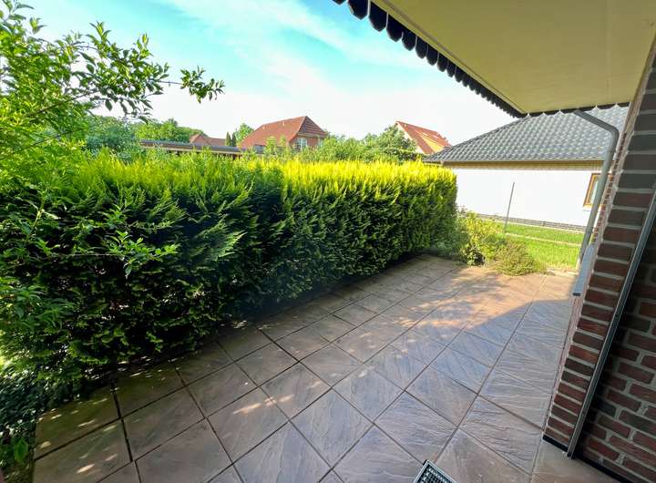 Das helle Wohnzimmer mit Essbereich führt auf eine große, teilweise überdachte Terrasse mit privatem Sichtschutz. Ein weiteres Zimmer eignet sich flexibel als Kinder-, Arbeits- oder Gästezimmer.