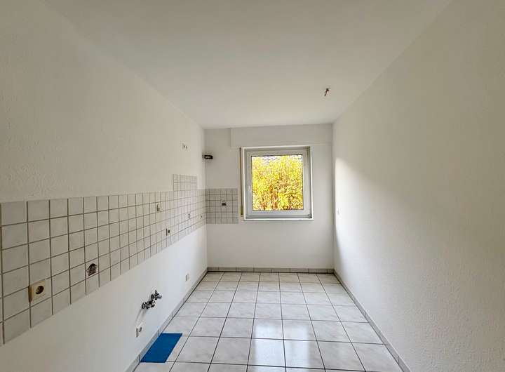 Das Badezimmer ist mit einer Badewanne ausgestattet und verfügt über einen Waschmaschinenanschluss. Das Schlafzimmer bietet ausreichend Stellfläche, und die Küche liegt praktisch im Zentrum der Wohnung. Ein kleiner Abstellraum im Flur sorgt für zusätzlichen Stauraum.