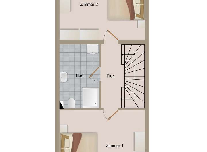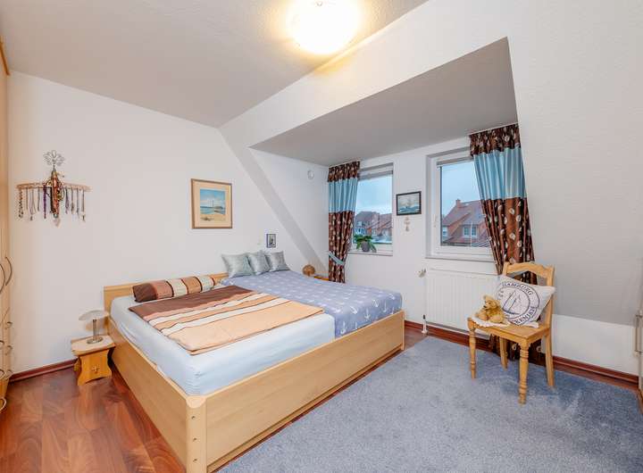 Das Obergeschoss umfasst zwei helle Zimmer mit Gaubenfenstern sowie ein Duschbad.