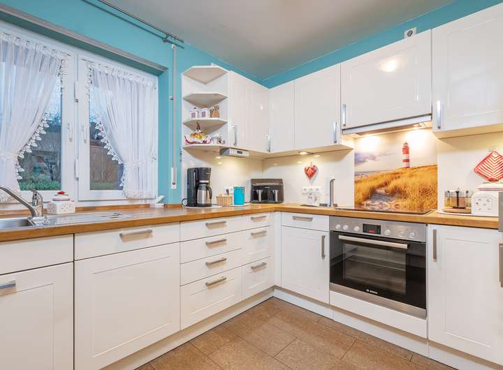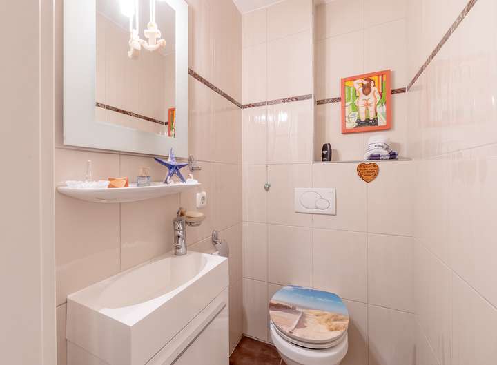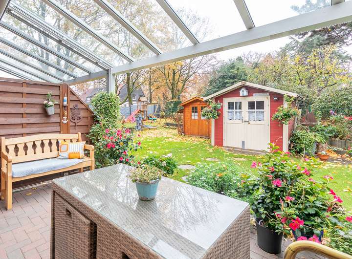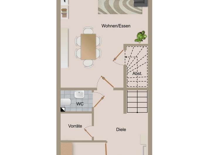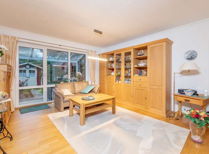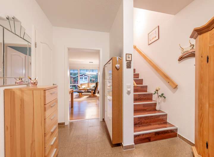 Im Erdgeschoss stehen eine Küche mit angrenzendem Vorratsraum, ein Gäste-WC sowie das Wohn- und Esszimmer mit direktem Zugang zur überdachten Südwest-Terrasse zur Verfügung. Diese bietet ideale Voraussetzungen für erholsame Stunden im Freien.
