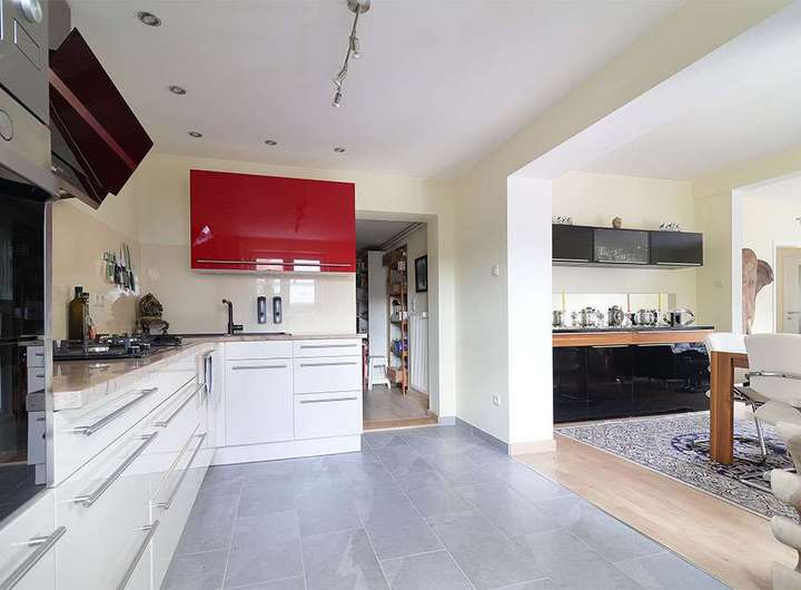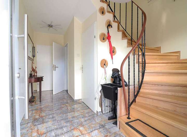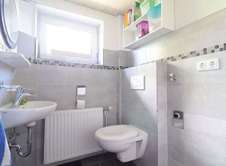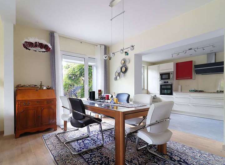 Durch den großzügigen und hellen Eingangsbereich gelangt man in das offene Wohn- und Esszimmer, mit angrenzender moderner Küche. Des Weiteren verfügt das Erdgeschoss über ein Duschbad, eine Vorratskammer, ein Gäste-WC und ein Gästezimmer.