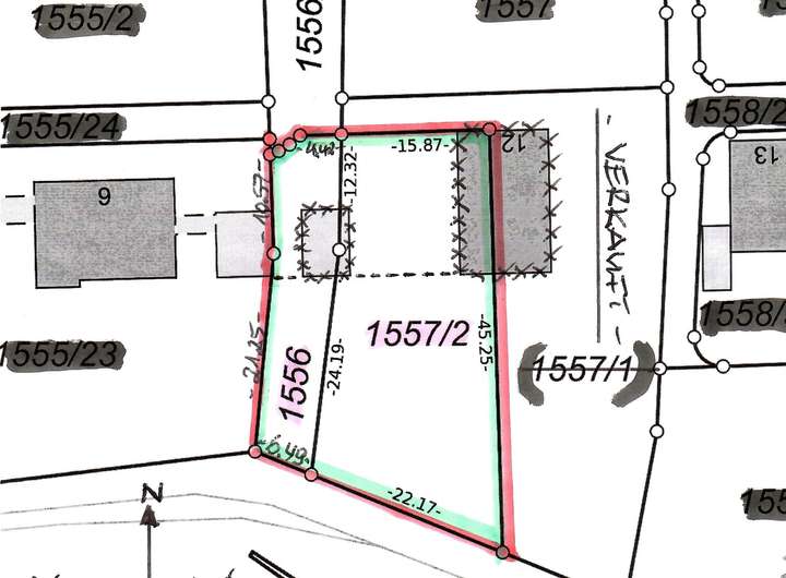 - Im beigefügten Lageplanausschnitt ist das zu verkaufende Grundstück farblich grün-rot umrandet = ZU VERKAUFEN