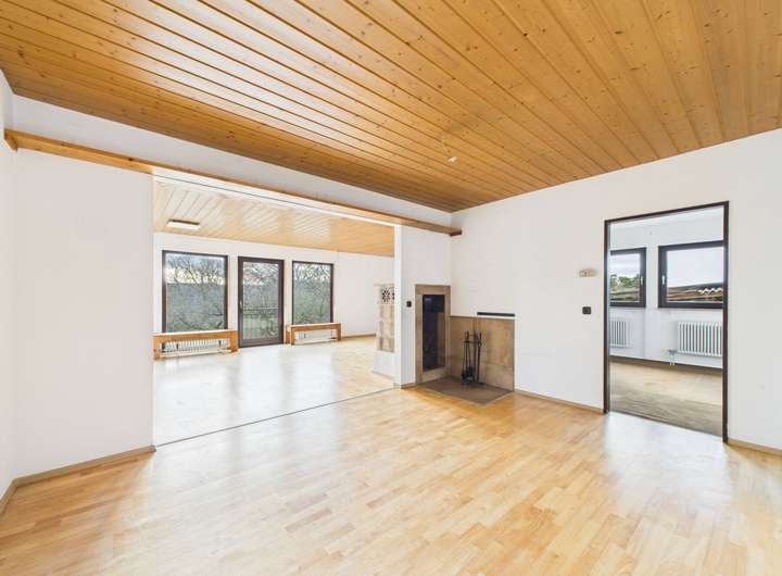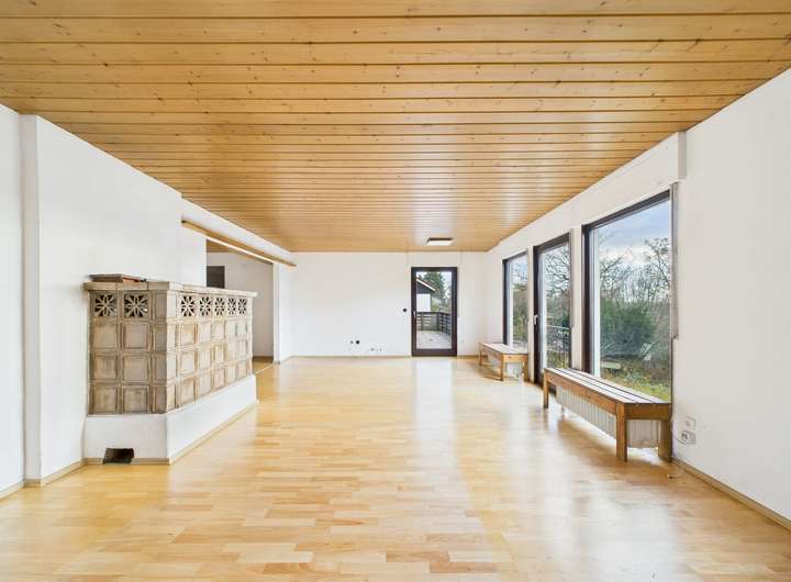 Im EG erwartet Sie ein großzügiger Wohn- und Essbereich mit Kachelofen und Zugang zum Balkon, der einen schönen Blick ins Grüne bietet. Neben dem Schlafzimmer stehen drei weitere Zimmer zur Verfügung, die sich flexibel als Kinder-, Gäste- oder Arbeitszimmer nutzen lassen. Eine Küche mit angrenzender Speisekammer, ein Tageslichtbad und ein separates WC ergänzen das Raumangebot auf dieser Ebene.