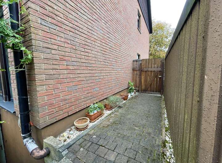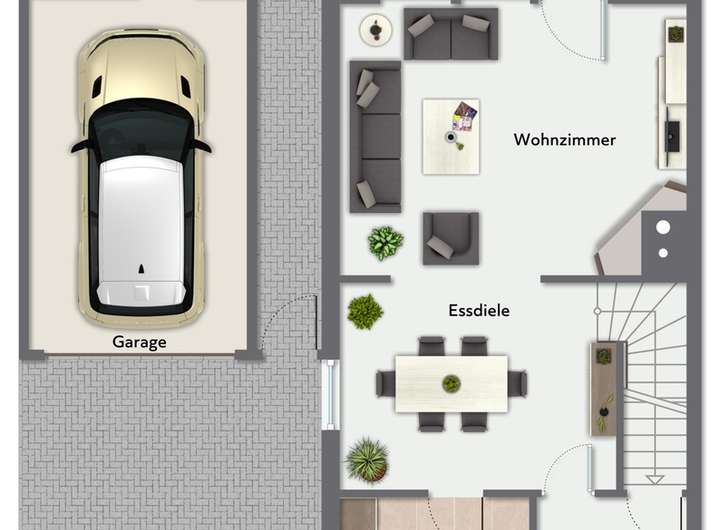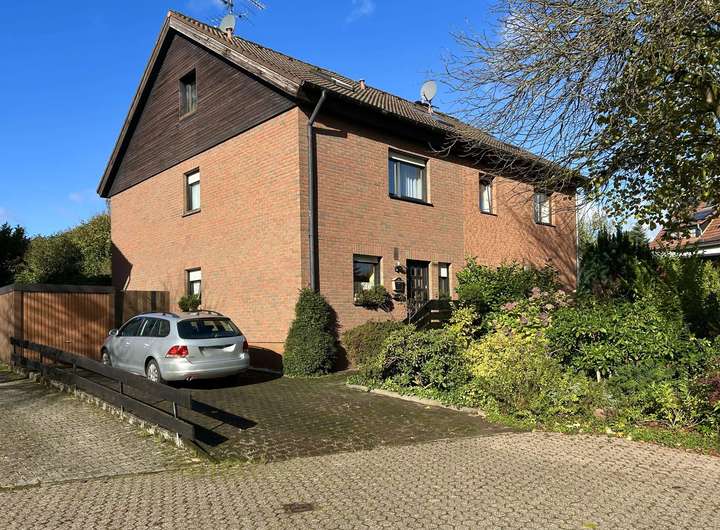 Der große Vorgarten, die große Einfahrt mit Platz für zwei hintereinanderparkenden Autos sowie die Garage mit seitlichem Gartenzugang empfängt Sie.