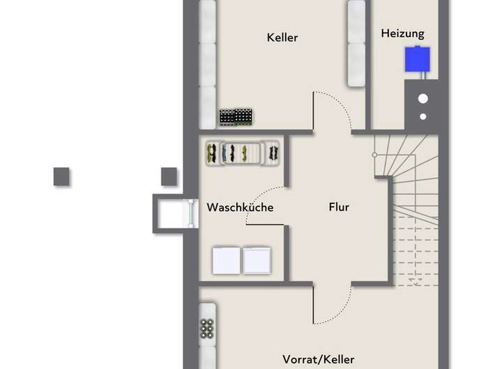 On Top kommt noch der Keller. Mit einer angenehmen Stehhöhe von 2,21 kann man diesen gut nutzen. Der Keller teilt sich auf in zwei klassische Abstellräume sowie eine Waschküche. In einem der Kellerräume ist die Heizung mit einer Trennwand untergebracht.
