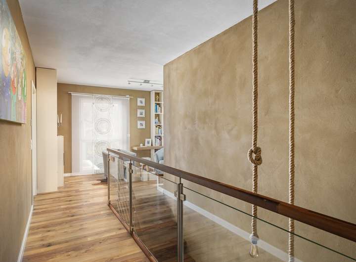 Im Obergeschoss mit seinen ca. 91 m² erreichen Sie über die Treppe eine großzügige Galerie, die sich ideal für einen Lese- oder Spielbereich sowie als Homeoffice eignet. Drei weitere Zimmer, die aktuell als Schlafzimmer, Kinderzimmer und Gästezimmer genutzt werden, bieten ausreichend Platz für Ihre Familie.